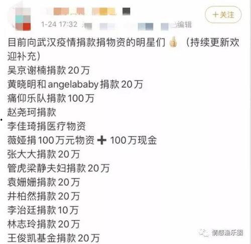 最近娱乐圈可是热闹非凡呢!咱们就来聊聊那件让无数人为之关注的事情——明星捐款武汉名单曝光啦!这名单一出,瞬间引发了网友们的热议,咱们也来一探究竟吧!